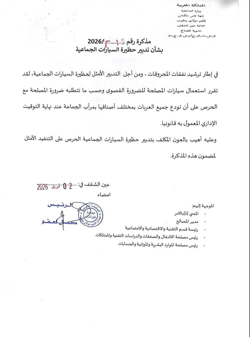 أصدر رئيس جماعة عين الشقف، الشاب الحركي كمال العفو، مذكرة إدارية جديدة تهم تدبير حظيرة السيارات الجماعية وسيارات المصلحة، وذلك في إطار ترشيد نفقات المحروقات والحد من الاستهلاك غير الضروري، في ظل الارتفاع المتواصل لأسعار الوقود.